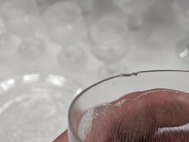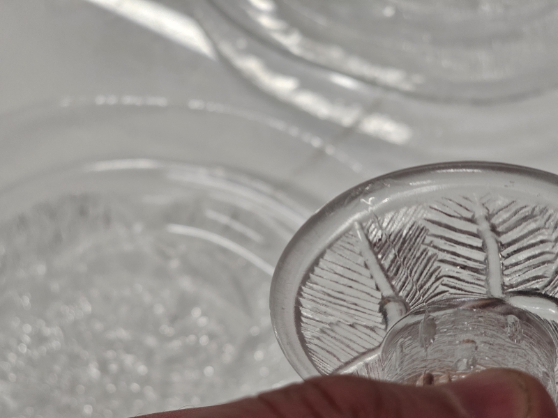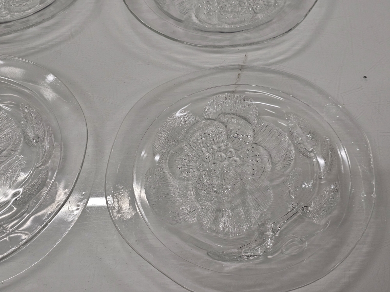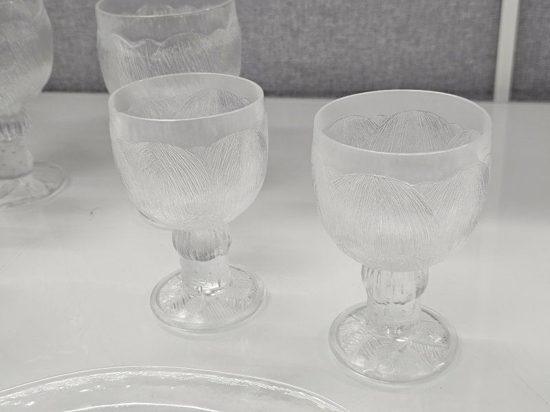 Lautasissa naarmuja, kahdessa pienemmässä lasissa kolhu. Lautasen h: 27cm