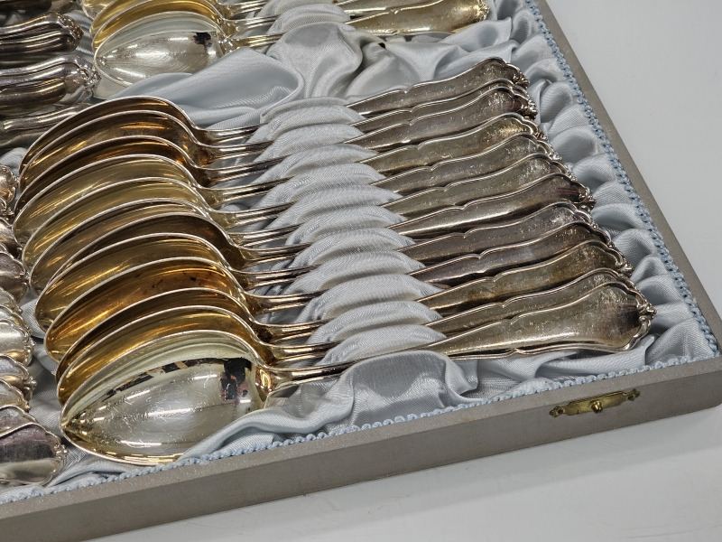 #1192 Hopeiset chippendale aterimet 12 hengelle säilytyslaatikossaan