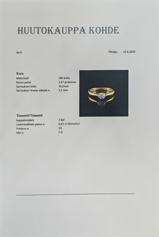 #1116 18k kultainen sormus 0,41ct timantilla, 2,67g