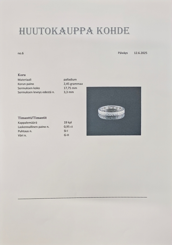 #1145 Palladiumsormus 19 timantilla [yht. 0,95ct], 2,45g