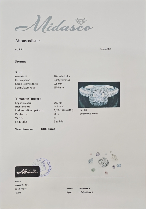 Bruttopaino 6,09g. Koko 15. Ei kaiverrusta. Mukana aitoustodistus vakuutusarvolla sekä uusi korurasia. Koko hyvin muokattavissa ammattilaisen toimesta [ei sisälly hintaan]