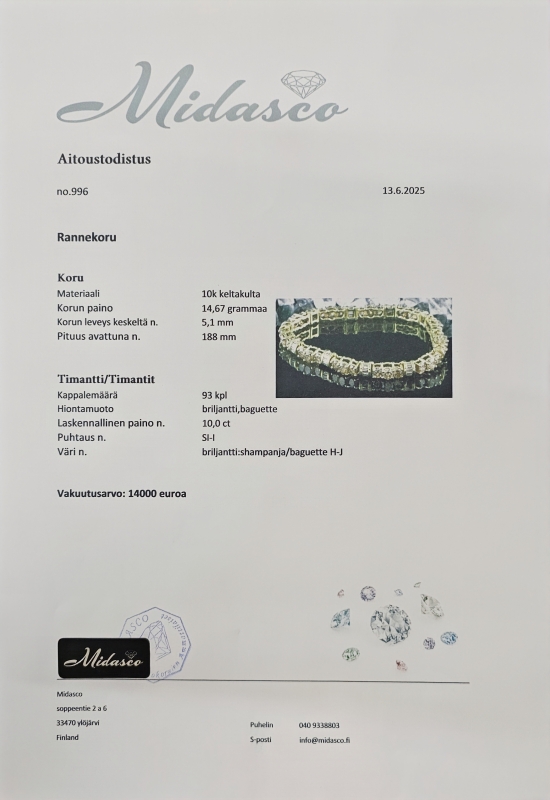#1234 10k kultainen rannekoru 93 timantilla [yht. 10,00ct], 14,67g [ovh. 14000€]