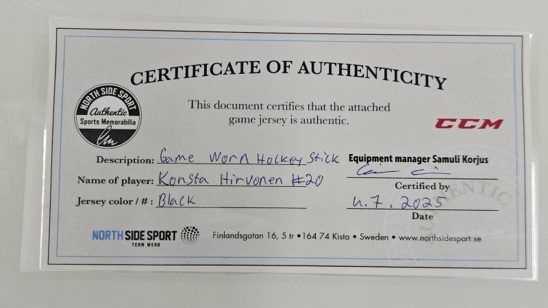 #1826 Lahden Pelicans myy: Pelissä käytetty signeerattu maila, Konsta Hirvonen #20