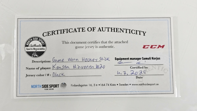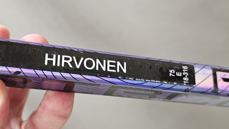 #1832 Lahden Pelicans myy: Pelissä käytetty signeerattu maila, Konsta Hirvonen #20