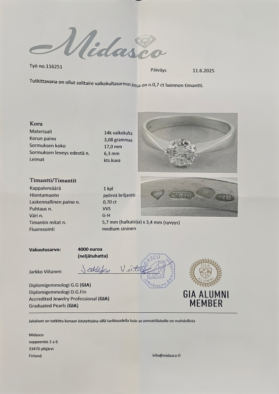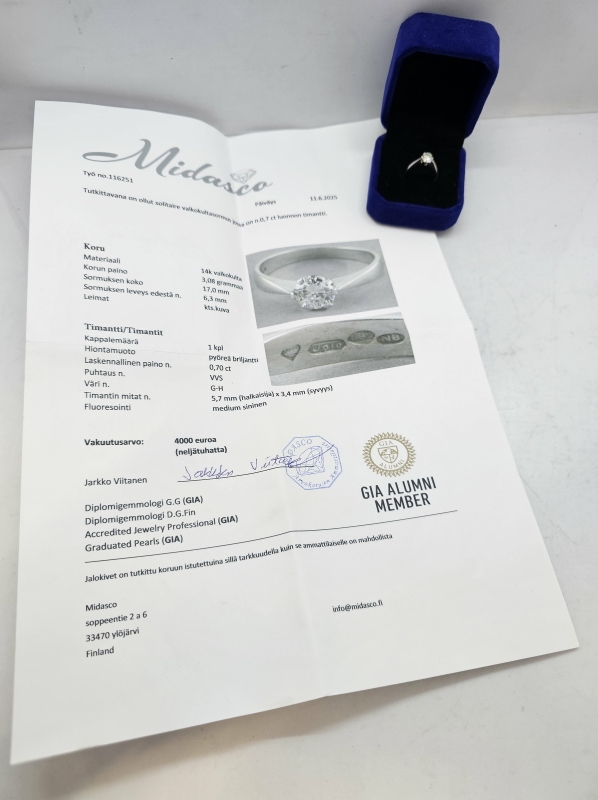Bruttopaino 3,08g. Ei kaiverrusta. Koko 17. Mukana aitoustodistus