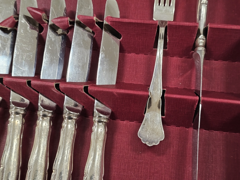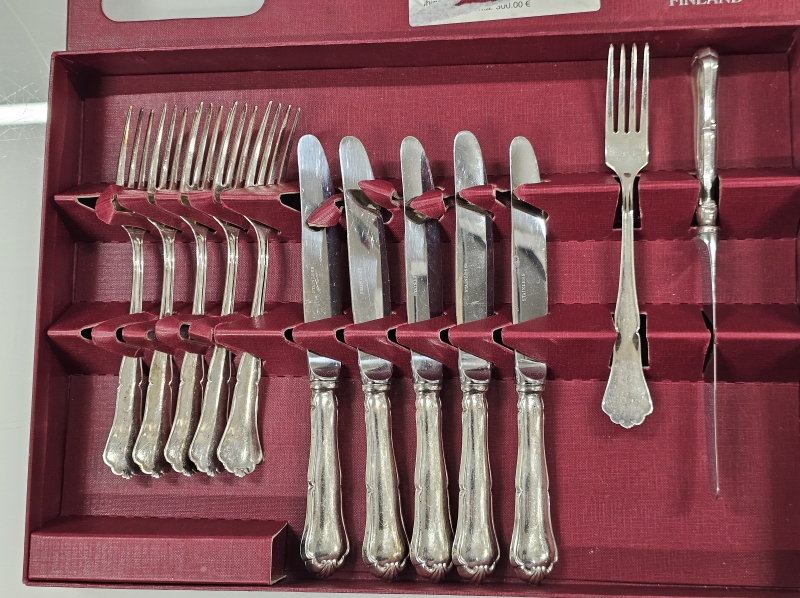 Haarukoiden paino 213g, teräskärkiset veitset 455g. Ei kaiverruksia. Veitsen p: 20,5cm
