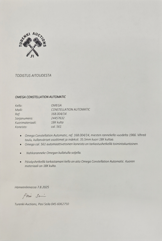 Ref: 168.004/14. Bruttopaino 50,56g [takakansi 8,2g]. Halkaisija 35,5mm. Vuodelta 1966. Mukana aitoustodistus. Kellotaulu mahdollisesti restauroitu / uudelleen maalattu.