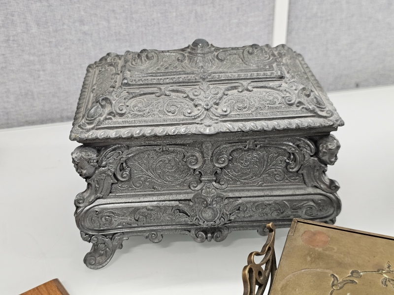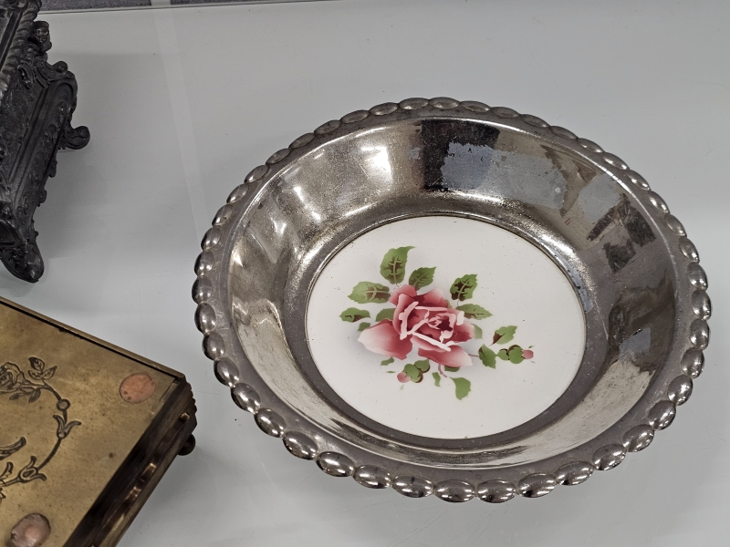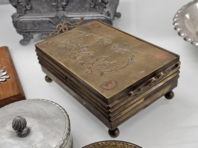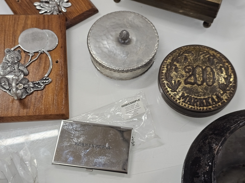 #2132 Erä metalliesineitä: Mm. näyttävä rasia, Pesis-palkinto, cloisonnea, tinasotilaita ym.