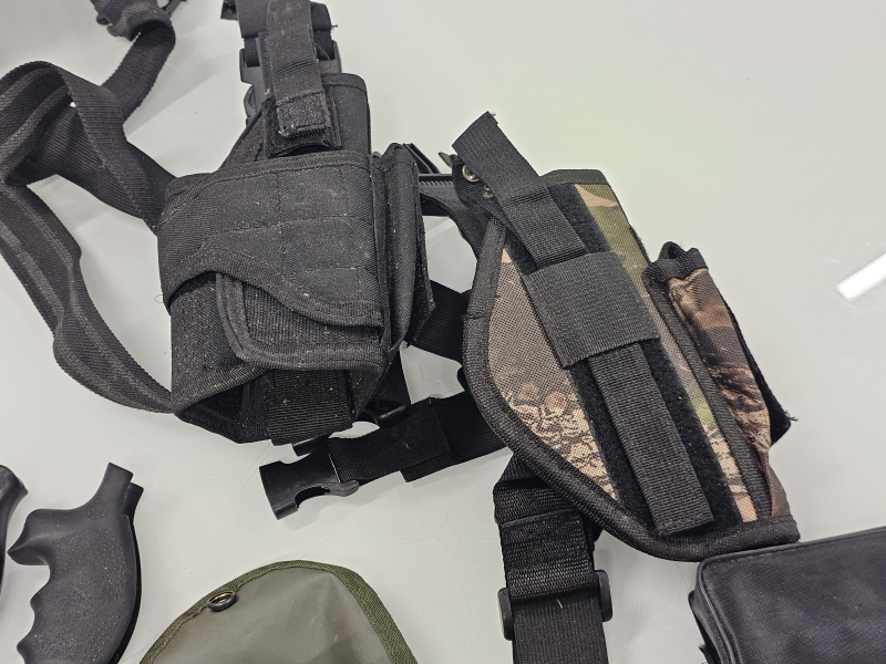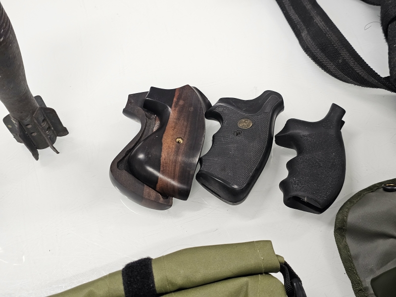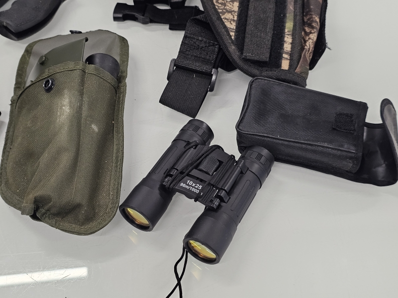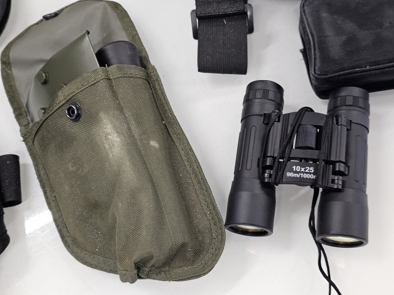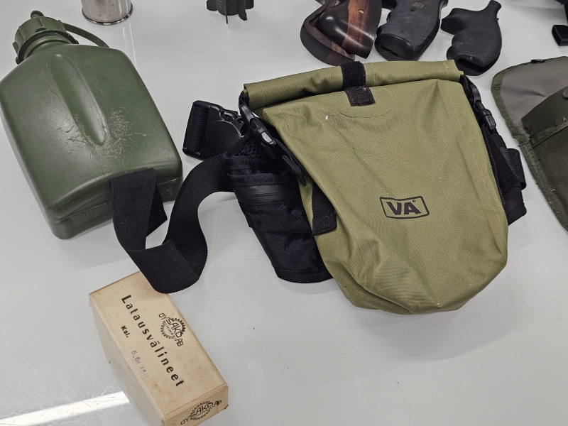 #1736 Erä armeijatarvikkeita: Mm. Kiikarit, kenttälapio, koteloita