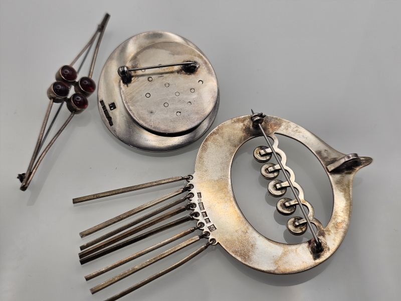 #1458 3kpl isoja hopeisia vintage rintaneuloja, mm. Kaunis Koru