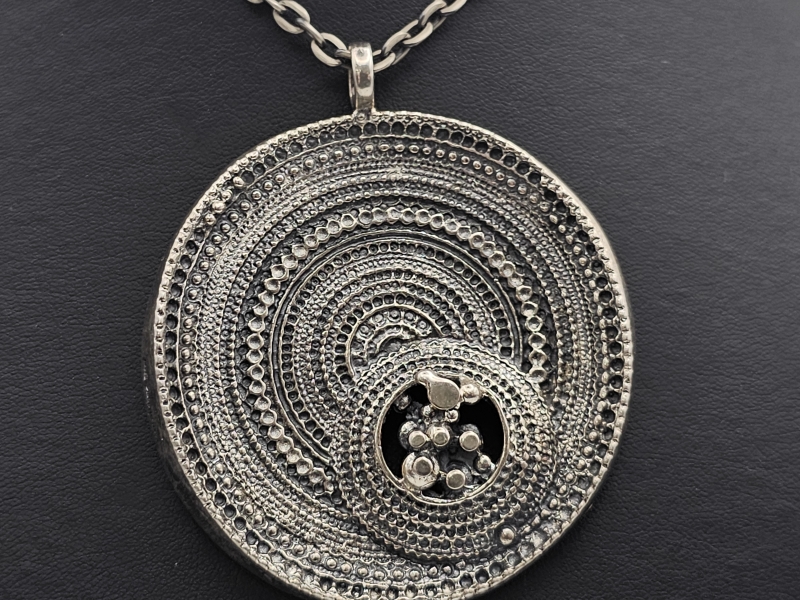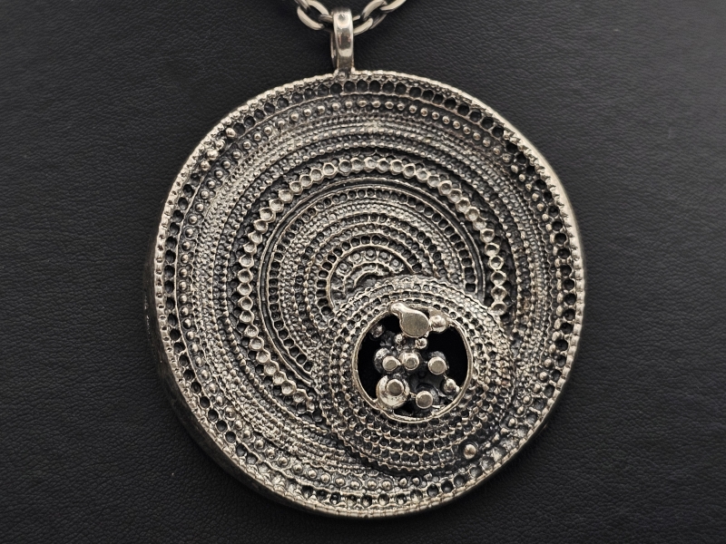 Riipuksen h: 64mm. Provenienssi: Useiden suomalaisten konsernien toimitusjohtajana toimineen miehen vaimolleen hankkimia koruja.
