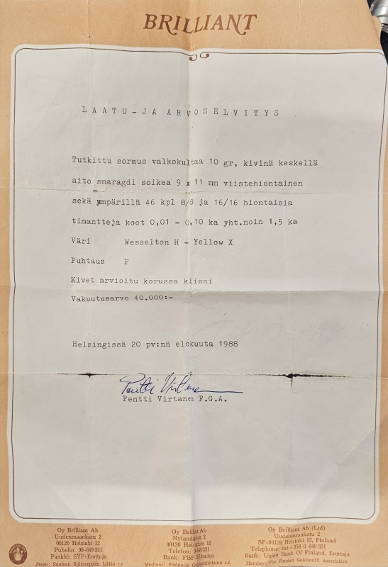 Bruttopaino 10,11g. Ei kaiverruksia. Koko 17. Mukana aitoustodistus. Yksi timanteista vaihdettu myöhemmin lab. timanttiin