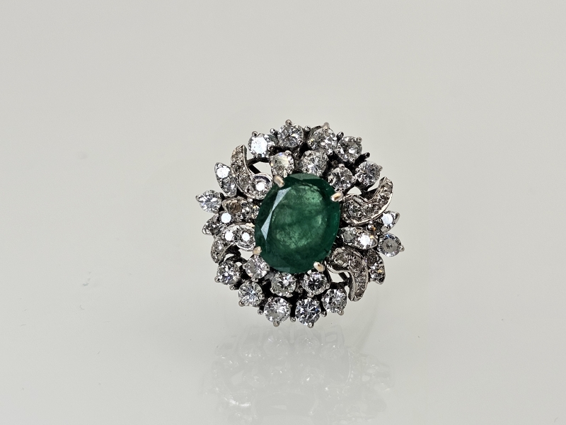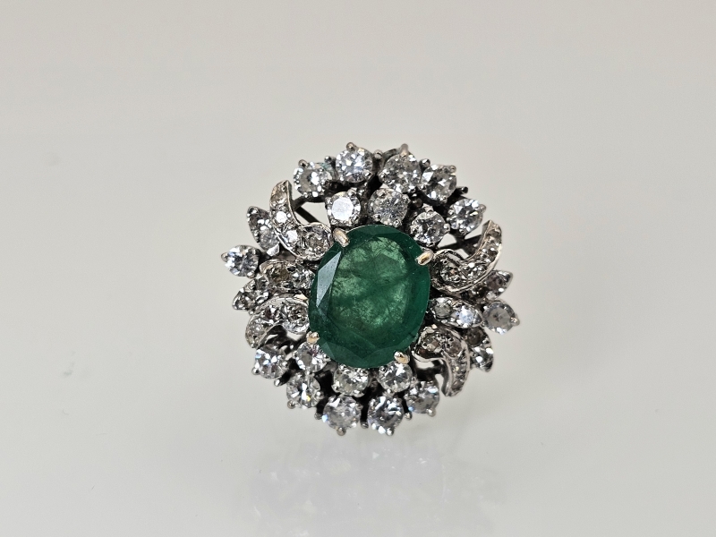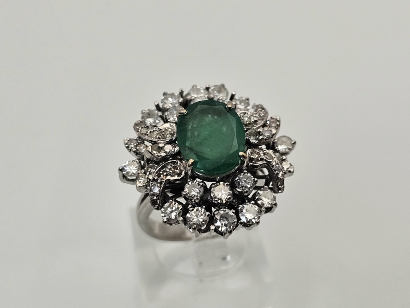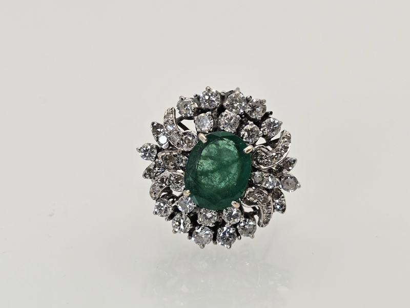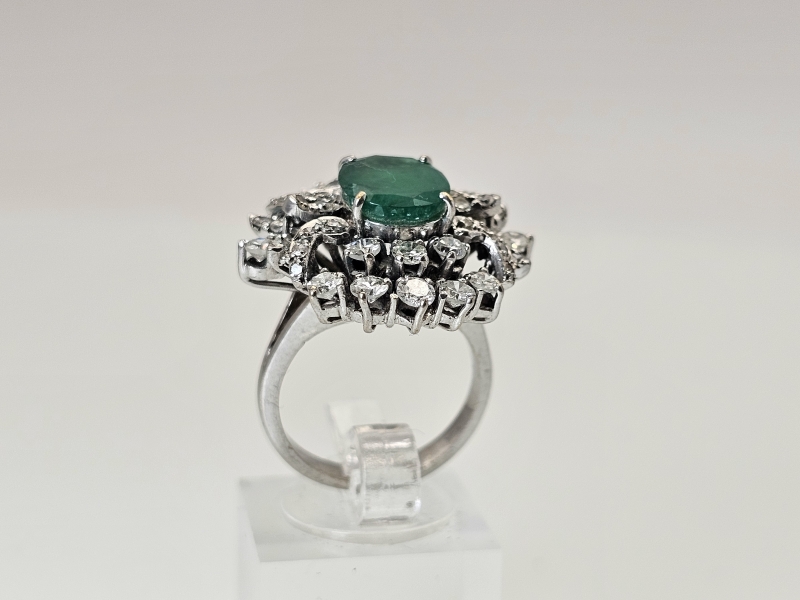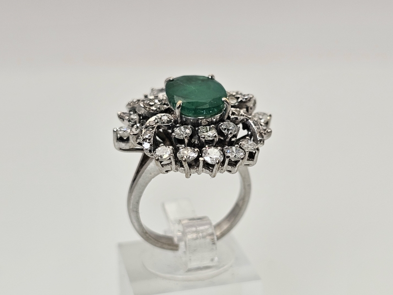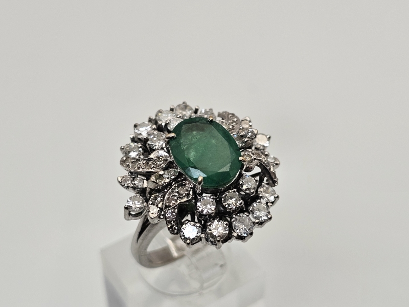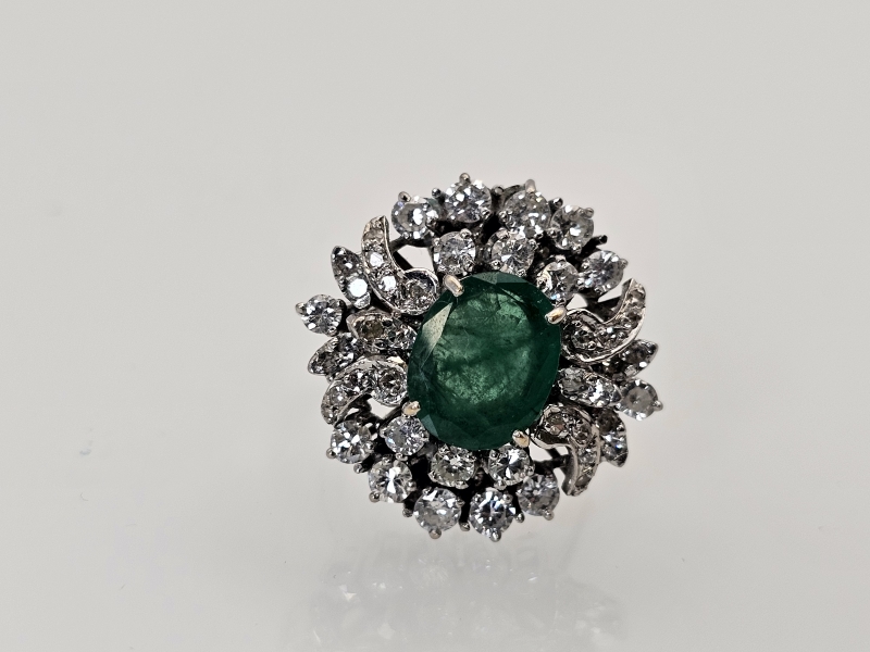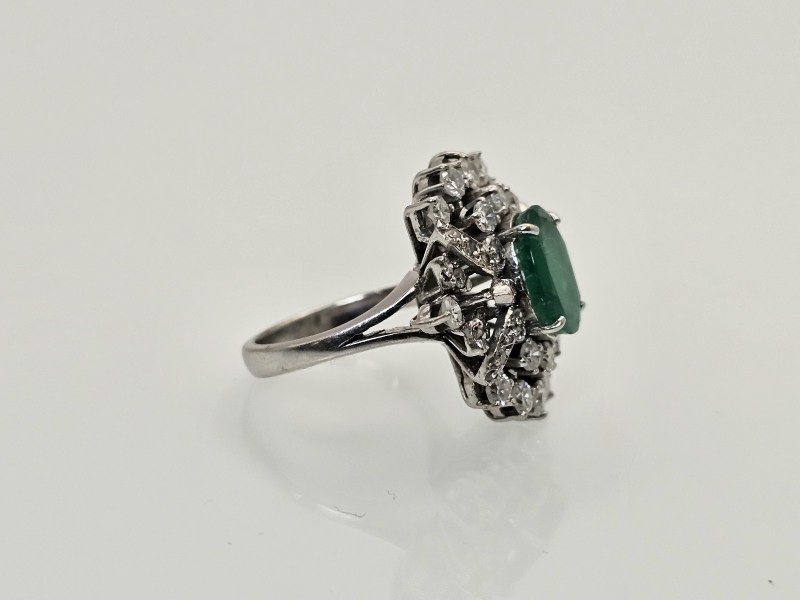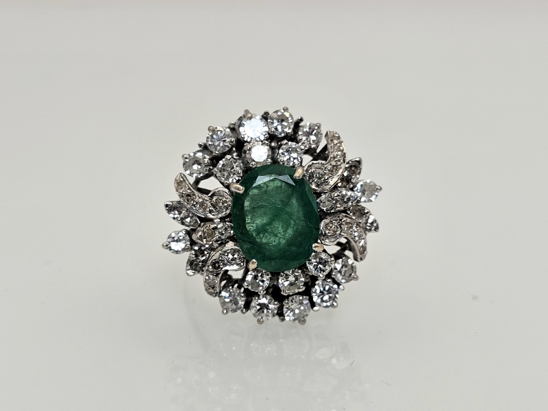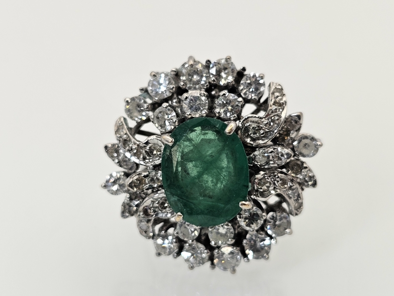 #1495 14k valkokultainen sormus jossa smaragdi [noin 3ct] ja 46kpl timantteja [yht. noin 1,5ct], 10,11g
