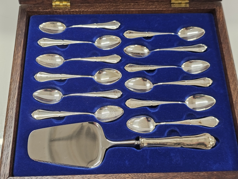 #986 - Hopeiset chippendale kakkulapio + 12kpl kahvilusikkaa
