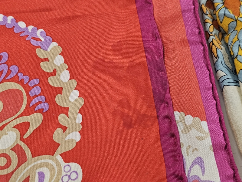 Laukun leveys 26cm. Toisessa huivissa tahroja. 85cm x 85cm. Laukussakin pientä käyttökulumaa