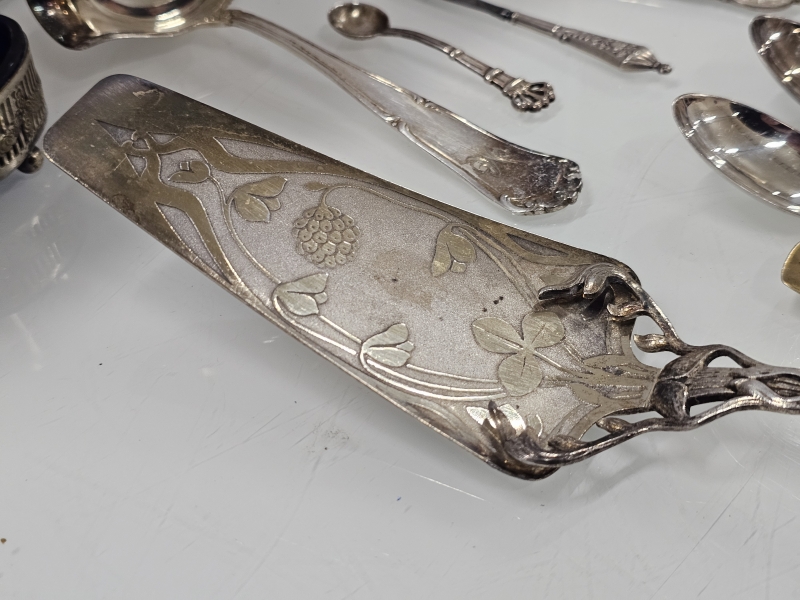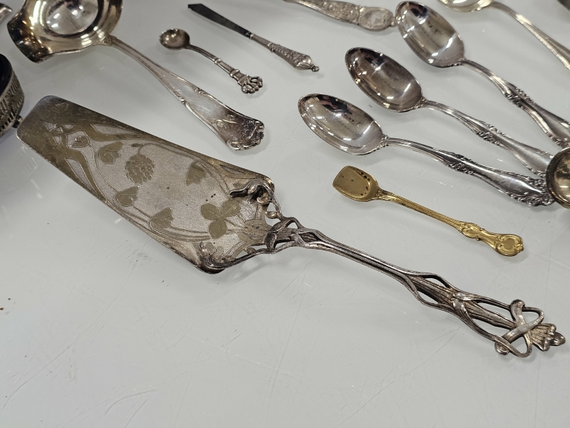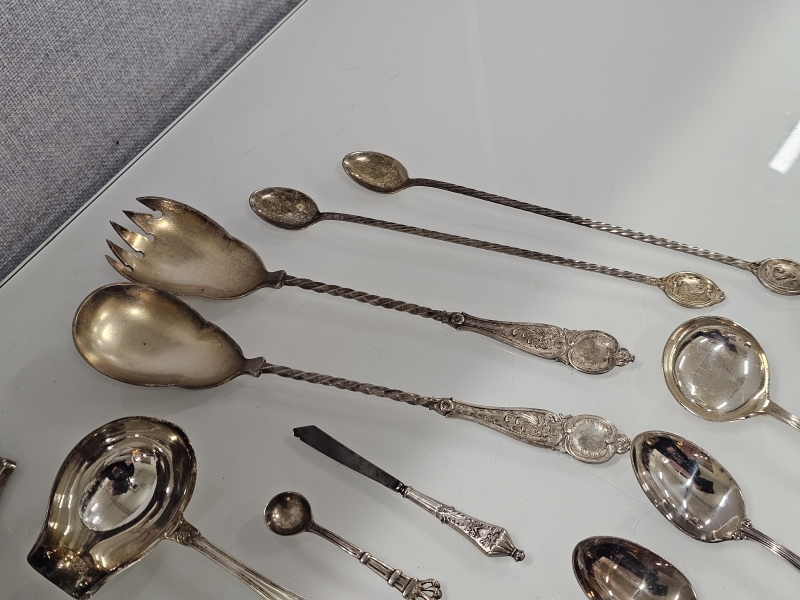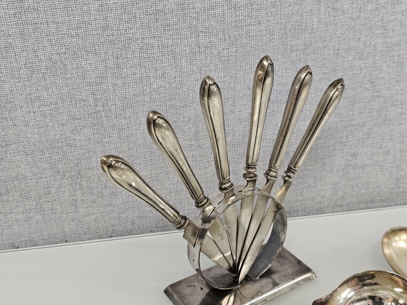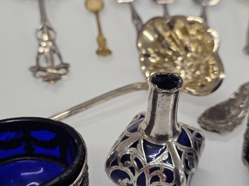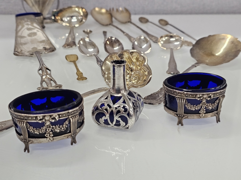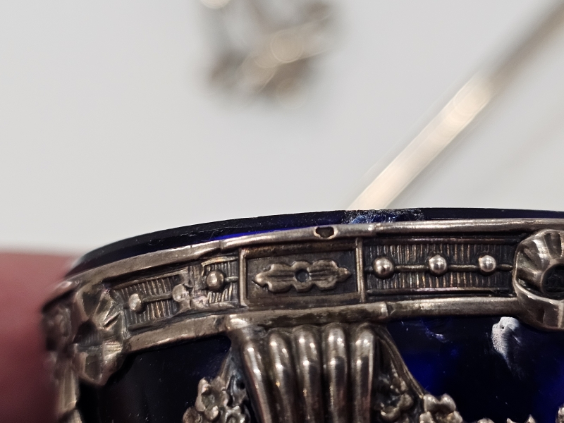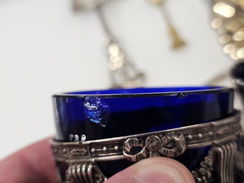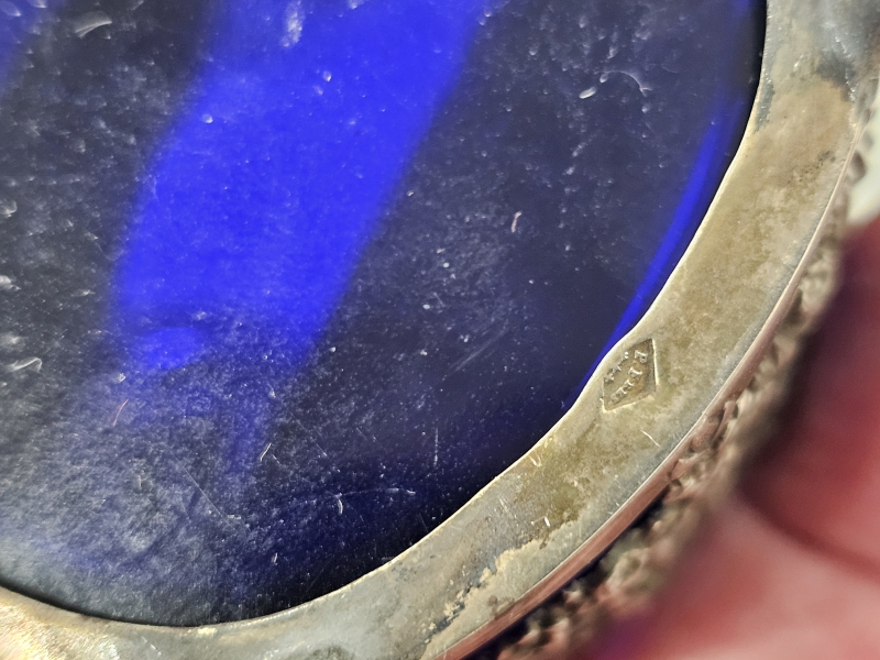 #920 - 3kpl sinisiä lasiesineitä hopeaosilla + hopeoituja ottimia ym.