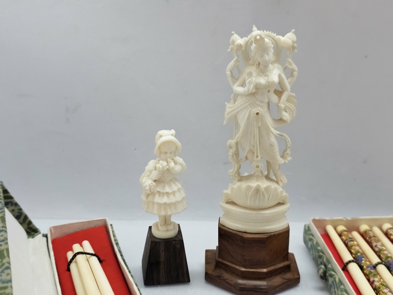 #2385 2kpl luisia patsaita, syömäpuikkoja + USA miniatyyrisytkäri