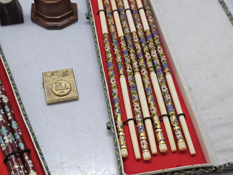 #2385 - 2kpl luisia patsaita, syömäpuikkoja + USA miniatyyrisytkäri