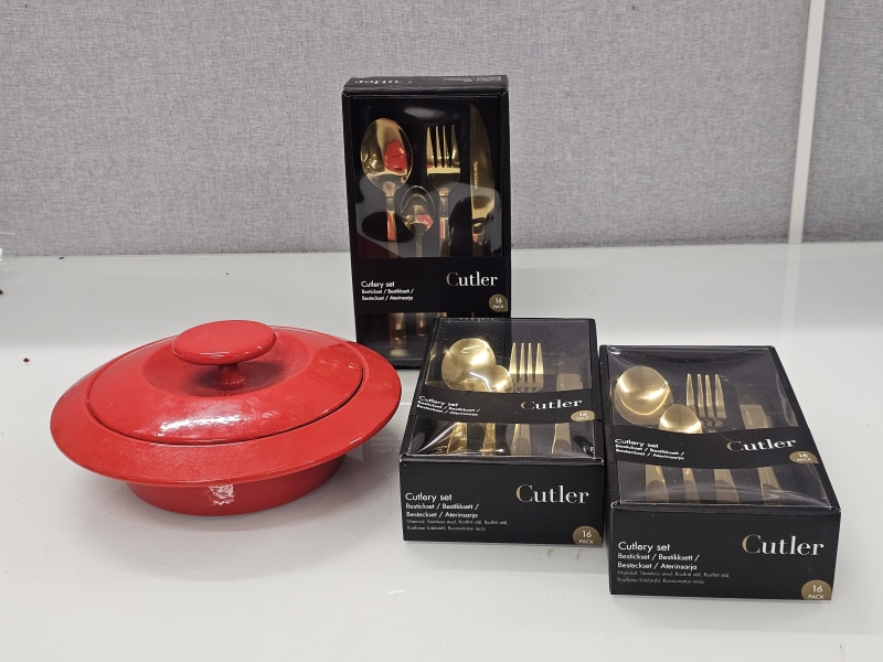 #2450 - 3kpl käyttämättömiä aterinsarjoja + Antti Nurmesniemi "Lentävä lautanen"