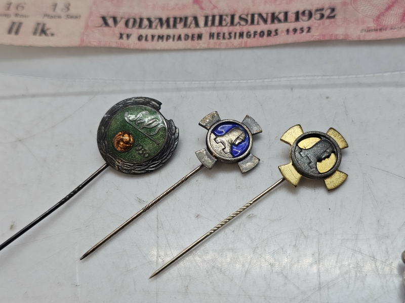 #1943 Hopeinen Kalevala korun Petsamon Kolttariipus + 1952 olympialaiset pääsylippu ym.