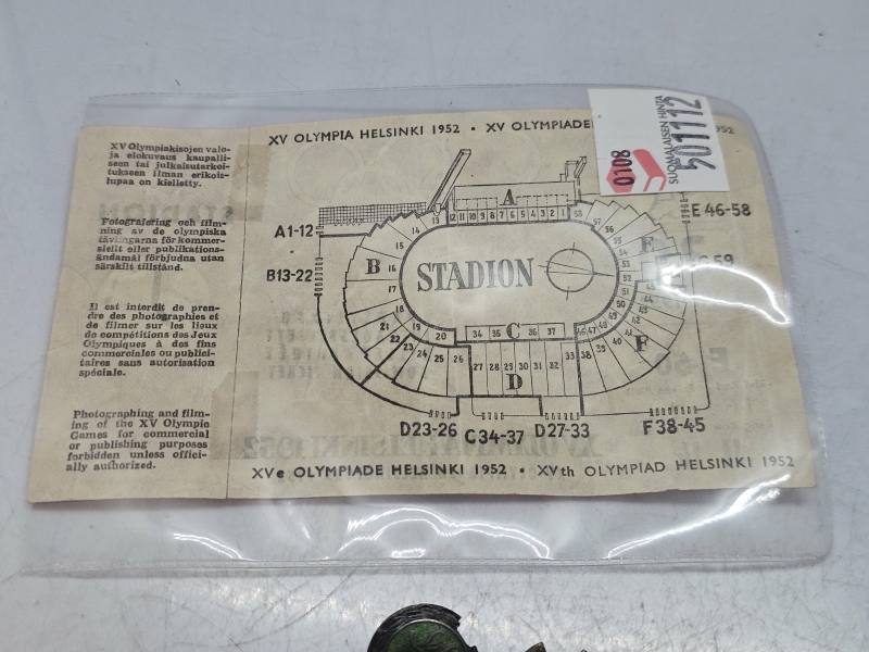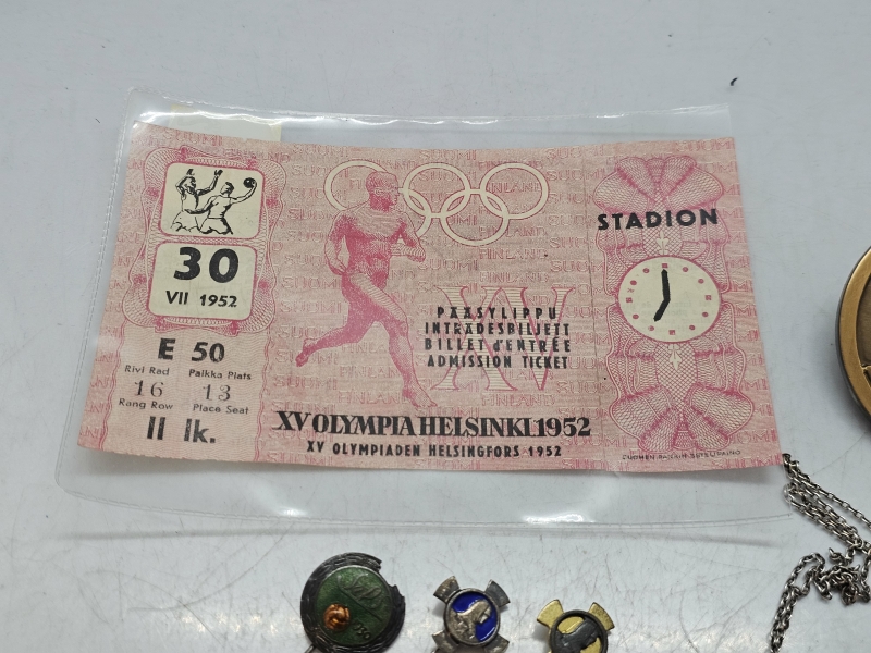 #1943 - Hopeinen Kalevala korun Petsamon Kolttariipus + 1952 olympialaiset pääsylippu ym.