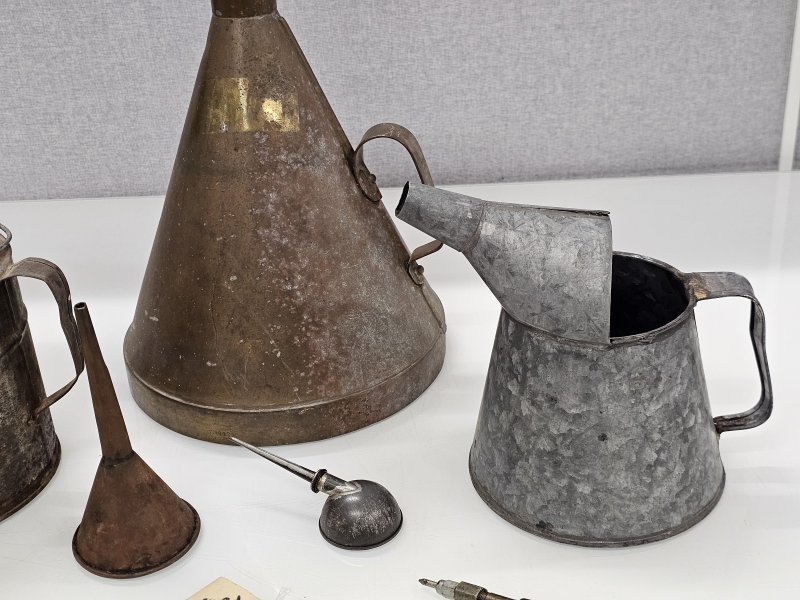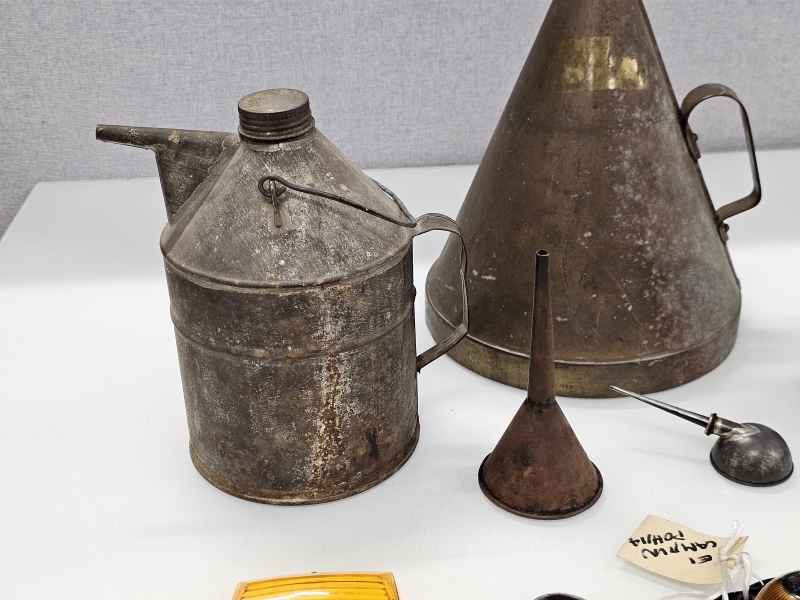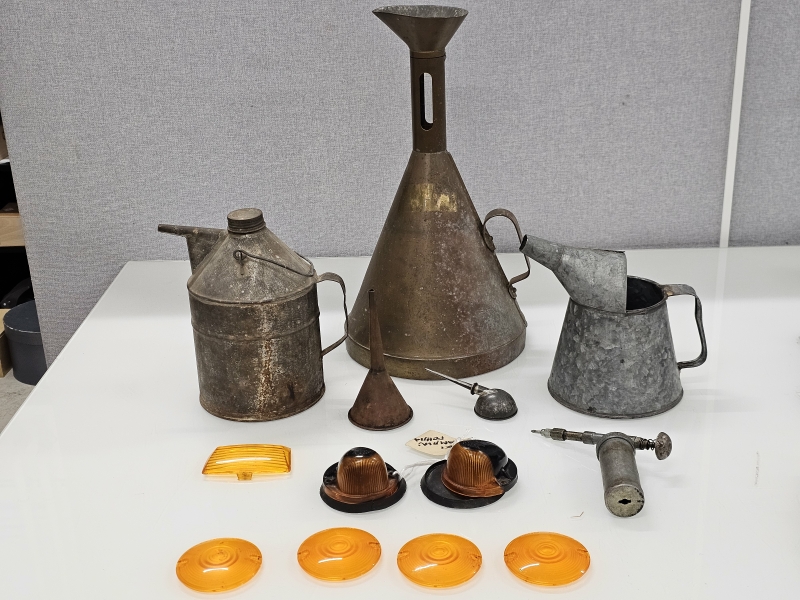 #2047 - Vanha iso mittakannu, öljykannu, Lincoln öljyprässi, HD kuvut ym.
