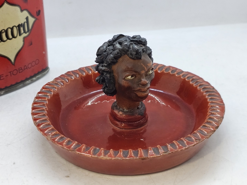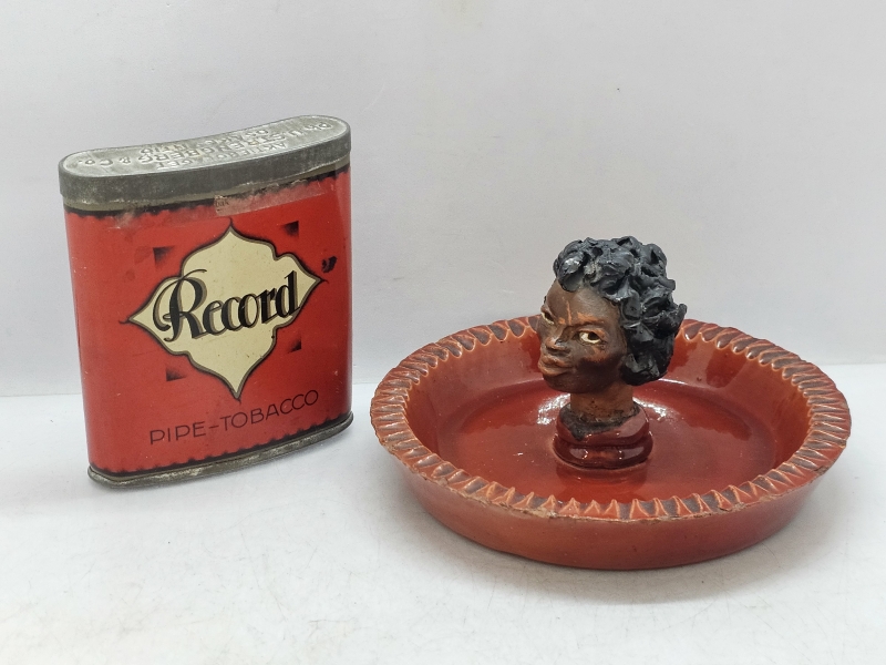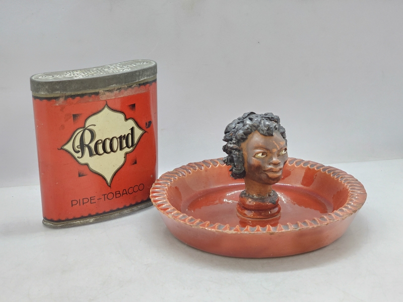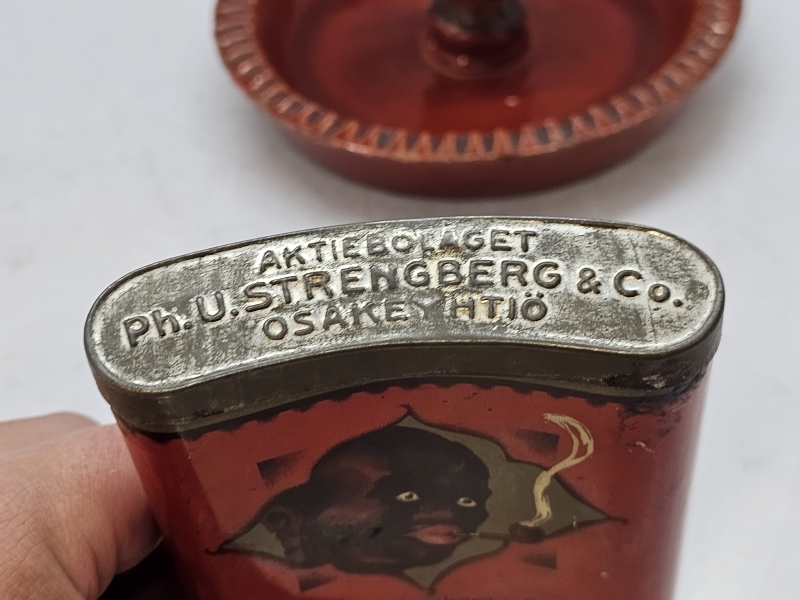 #2088 Vanha peltinen Strengberg Record tupakkarasia + keraaminen kotimainen tuhka-astia