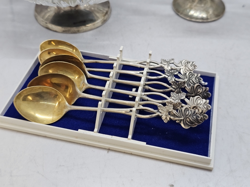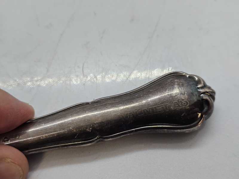 Lusikat 47g, teräskärkiset ottimet 146g. Maljakossa muutama minimaalinen kolhu sivussa. Isomman sokerikon h: 12,5cm. Kakkuottimissa kaiverrus