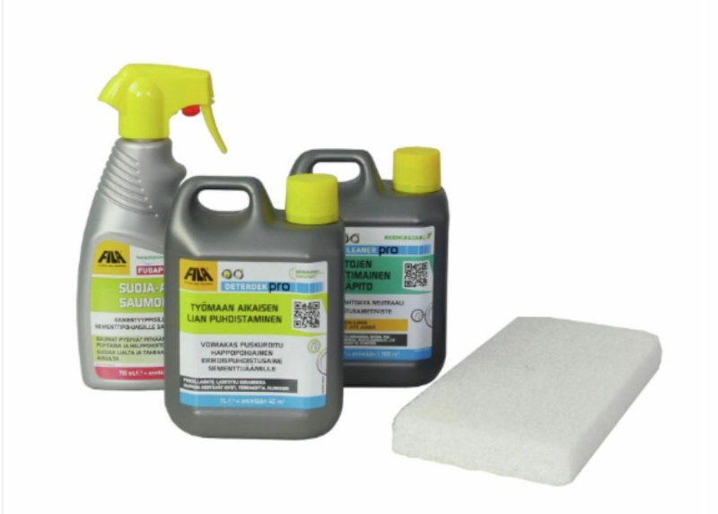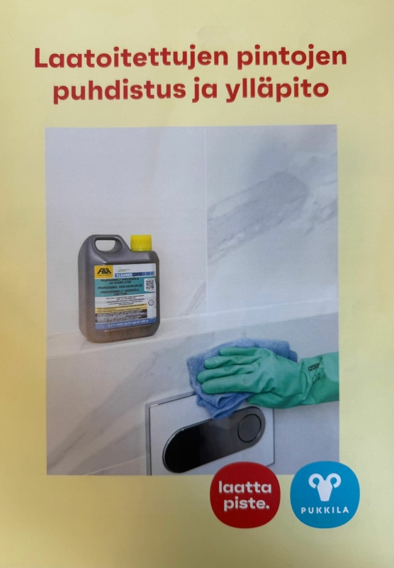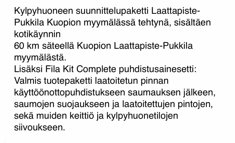 #25 Kylpyhuoneen suunnittelupaketti Laattapiste Pukkila Kuopion myymälässä tehtynä, sisältäen kotikäynnin 60km säteellä Kuopion myymälästä ja lisäksi Fila Kit Complete puhdistusainesetti.