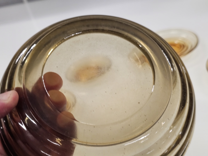 Pienempien lautasten pohjista paloja pois, isompi kulho ok. Isoin h: 18,5cm