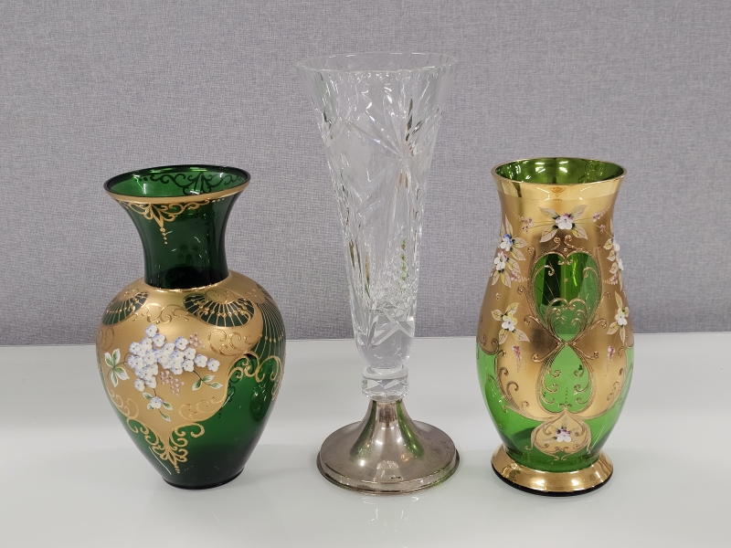 #124 - Kristallimaljakko hopeajalalla + 2kpl Murano / Bohemia maljakoita kultauksella
