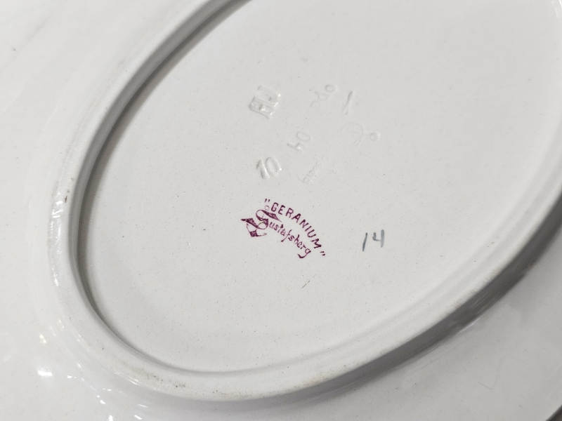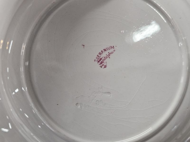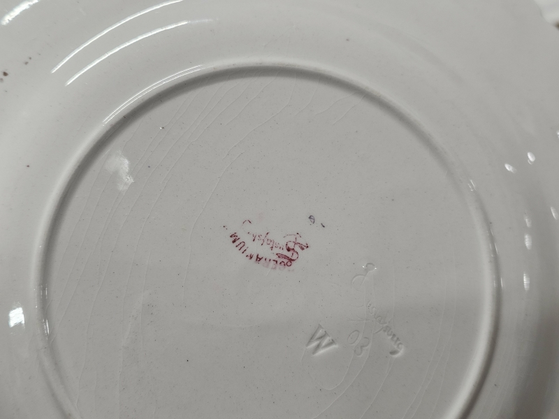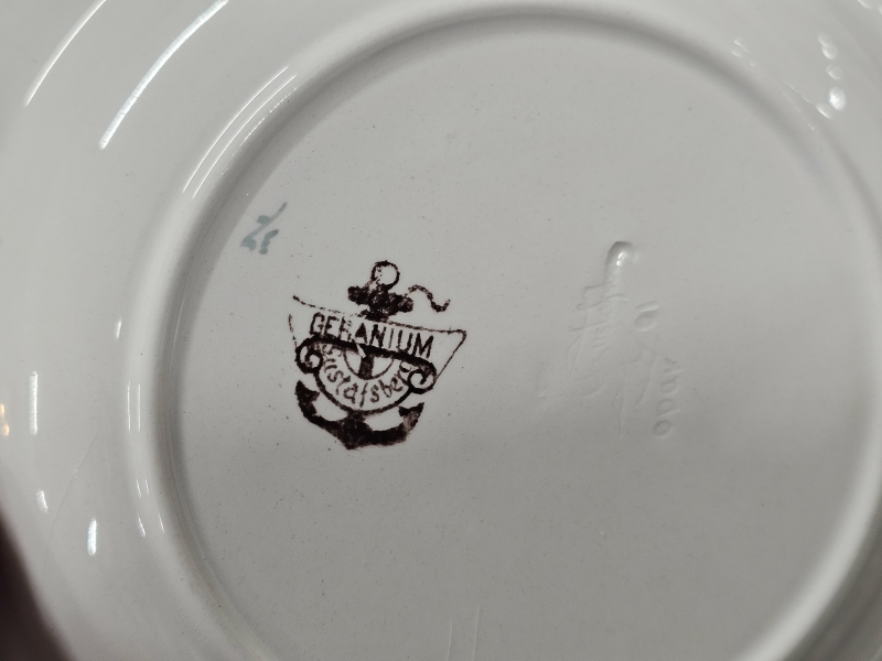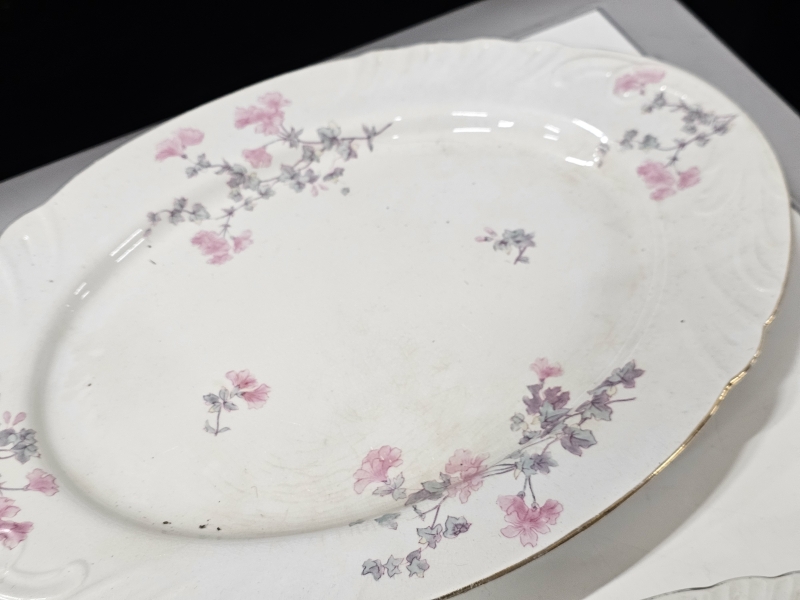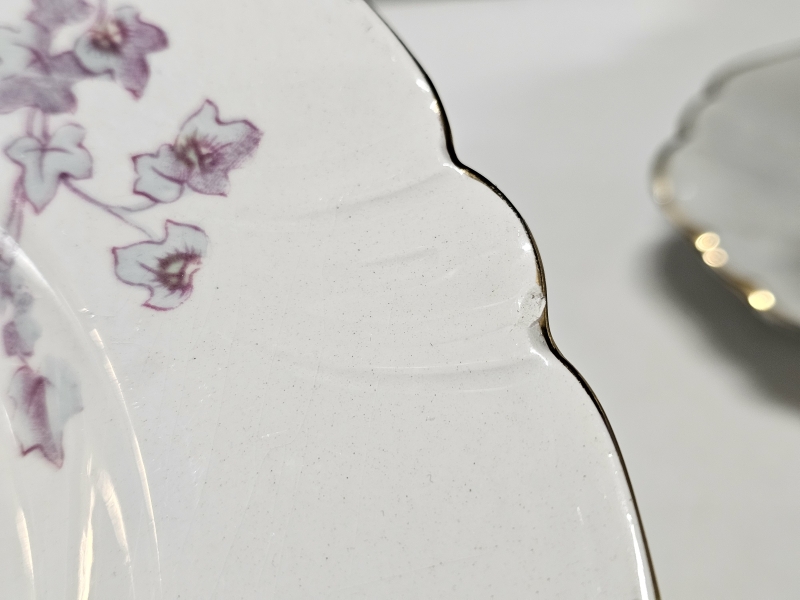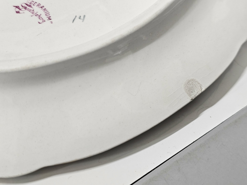 Krakeloitumaa, kulumaa, värjäytymiä. Yhdestä tarjoilulautasesta ja muutamasta lautasesta pala pois