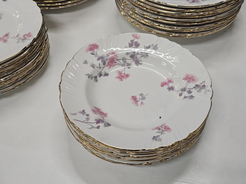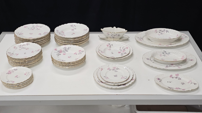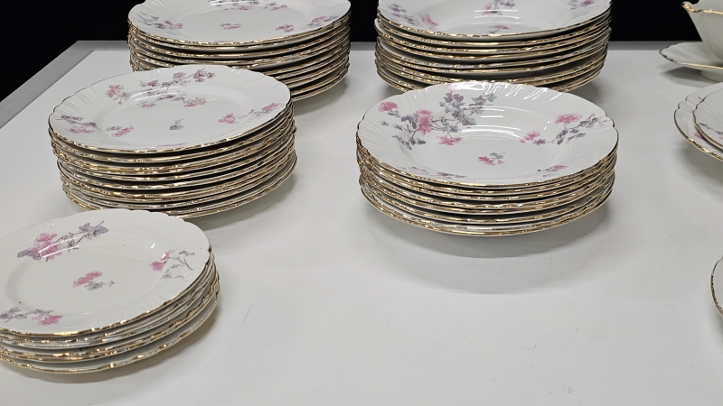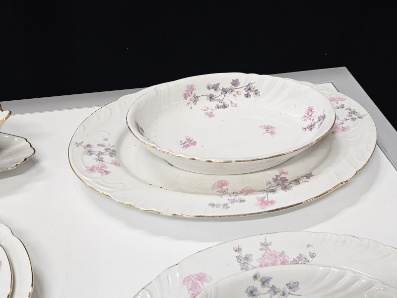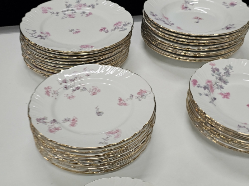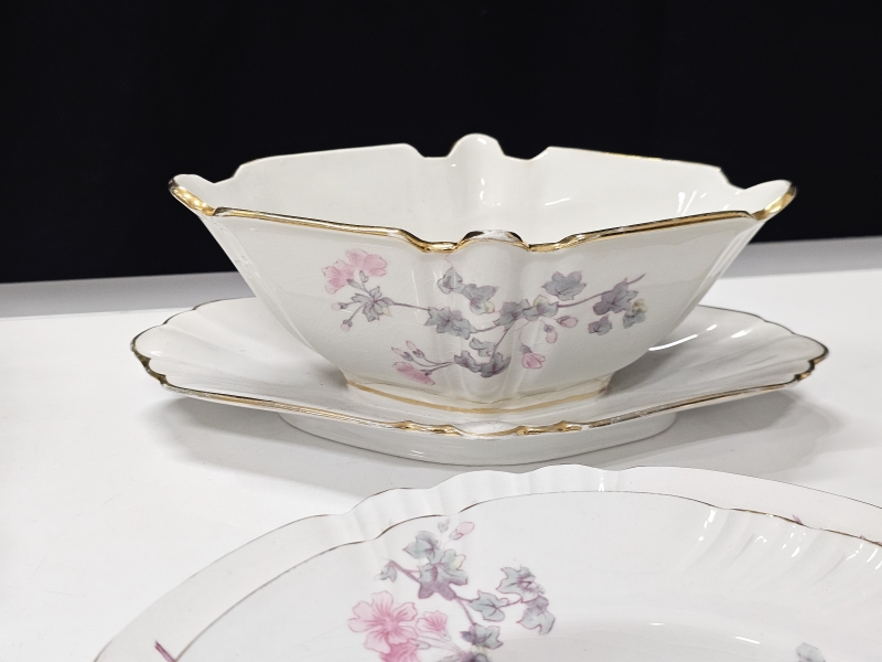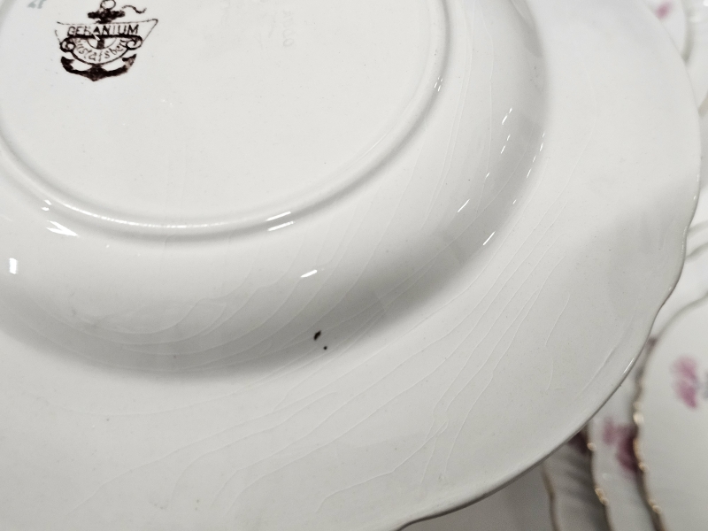 Krakeloitumaa, kulumaa, värjäytymiä. Yhdestä tarjoilulautasesta ja muutamasta lautasesta pala pois