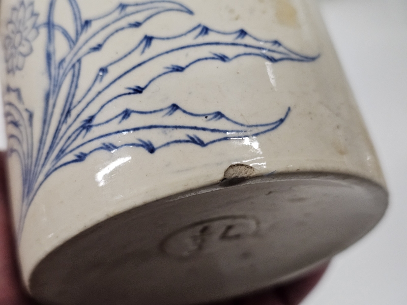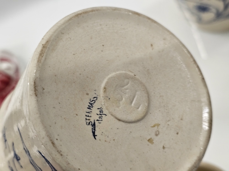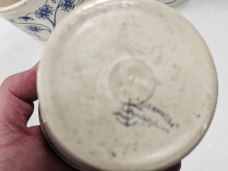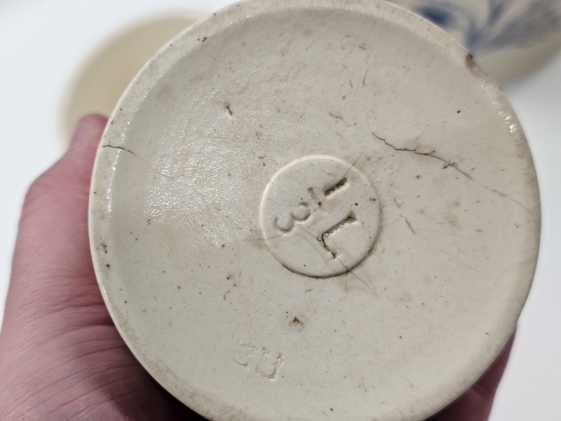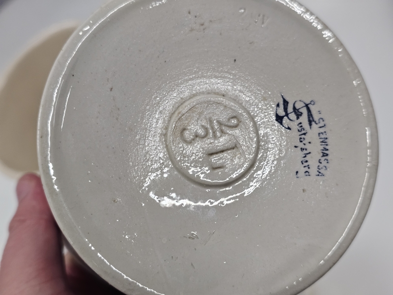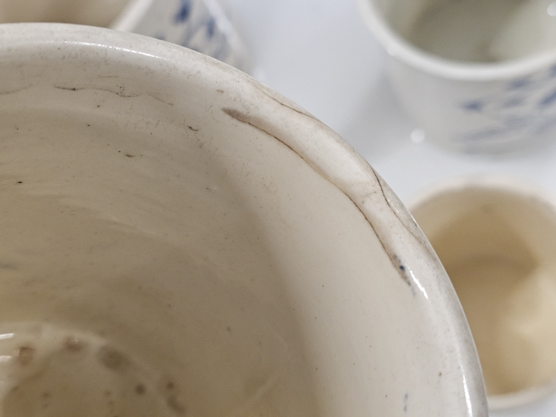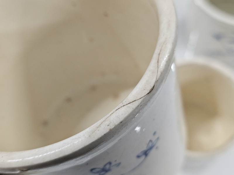 Yhdestä pieni pala pois pohjasta, toisessa halkeama, käyttökulumaa, värjäymää. Korkein 14cm