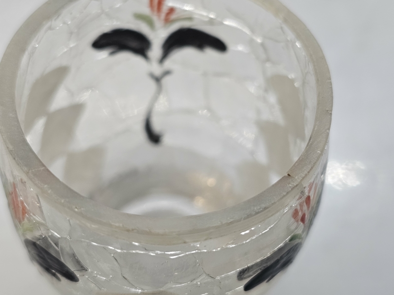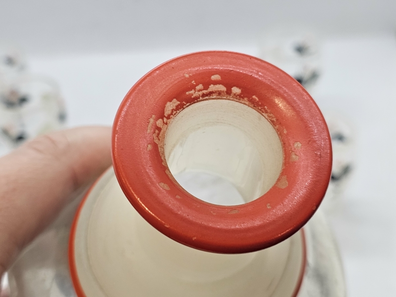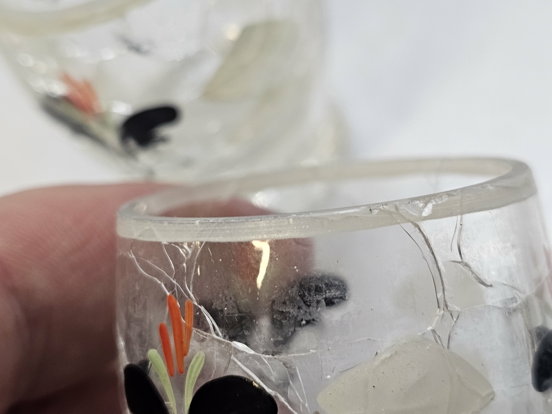 Hieman kulumaa. Lasien reunoissa muutama pieni vika