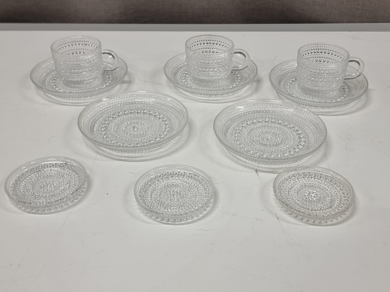 Pikkulautasien reunoissa pieniä kolhuja. Kupin halkaisija 7cm ja isomman lautasen halkaisija 14cm.