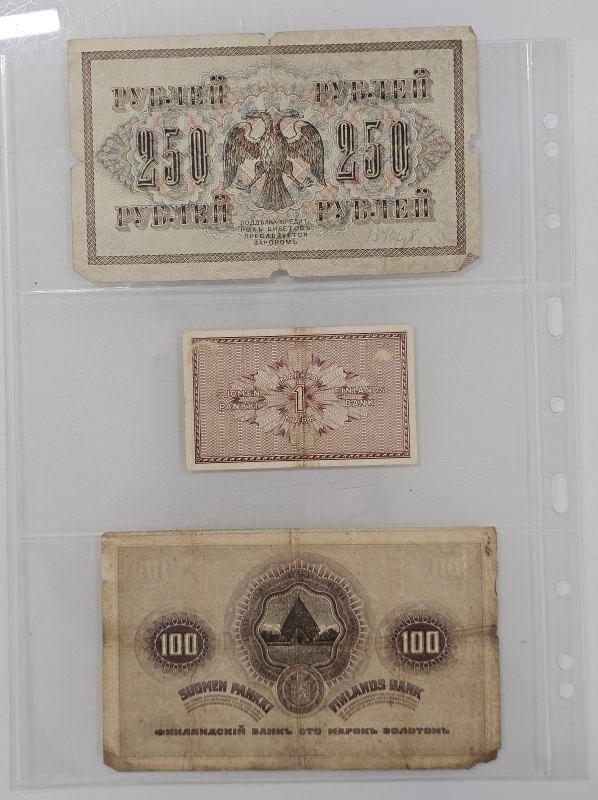 #1502 3kpl seteleitä: 100mk 1909 / 1mk 1918 / Venäjä 250 ruplaa 1917