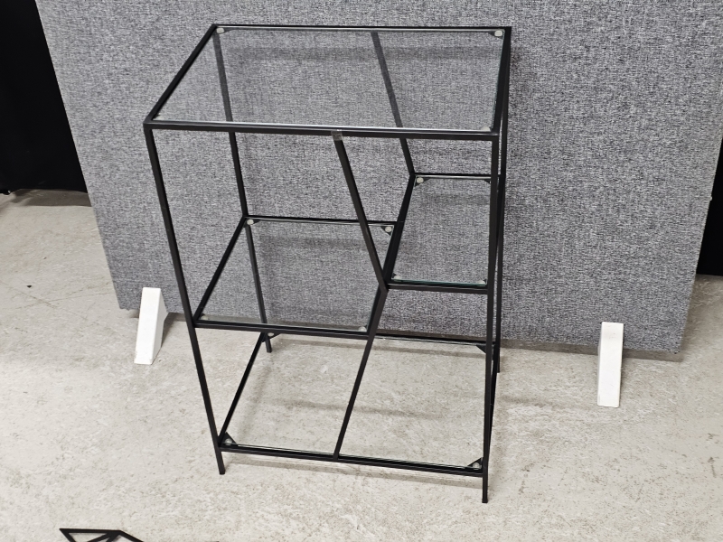 #2504 Metallinen lasihyllykkö & abstrakti maailmankartta