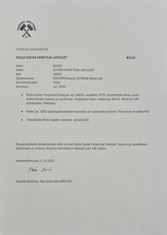 Halk: 35mm. Mukana Rolex -nahkakotelo ja aitoustodistus. Ref: 16013