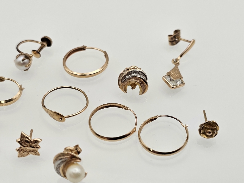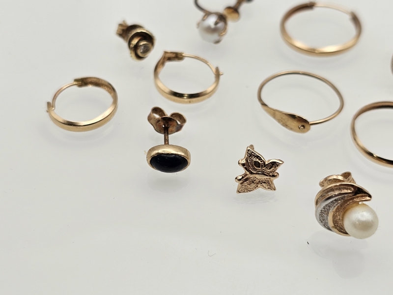 #1183 Erä 14k kultaisia koruja: Yksittäisiä korvakoruja ja joitakin vääntyneitä, 5,29g