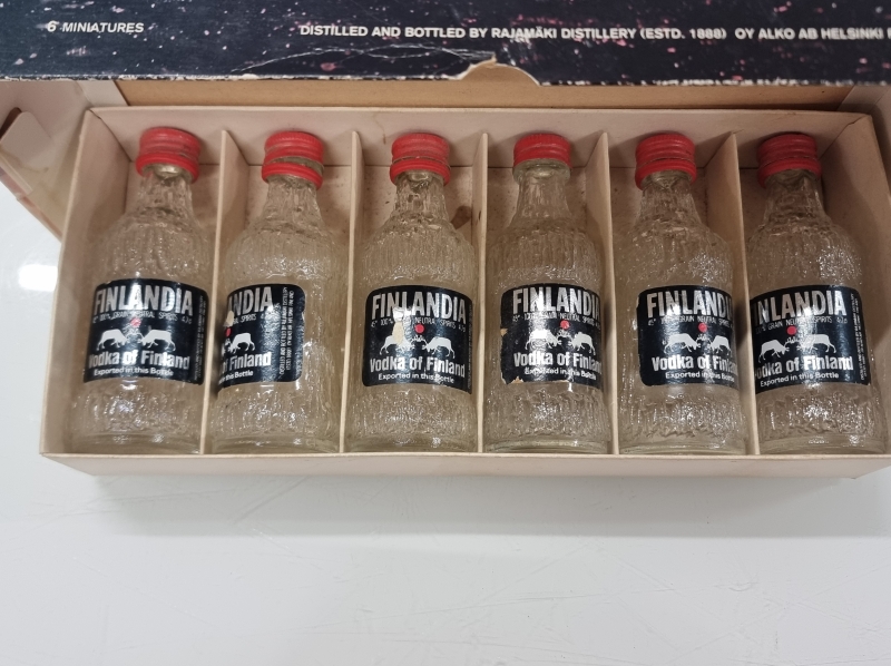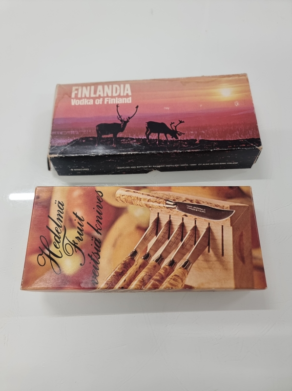 #2048 Iisakki Järvenpää hedelmäveitset + Finlandia vodka pullot alkuperäispakkauksissa