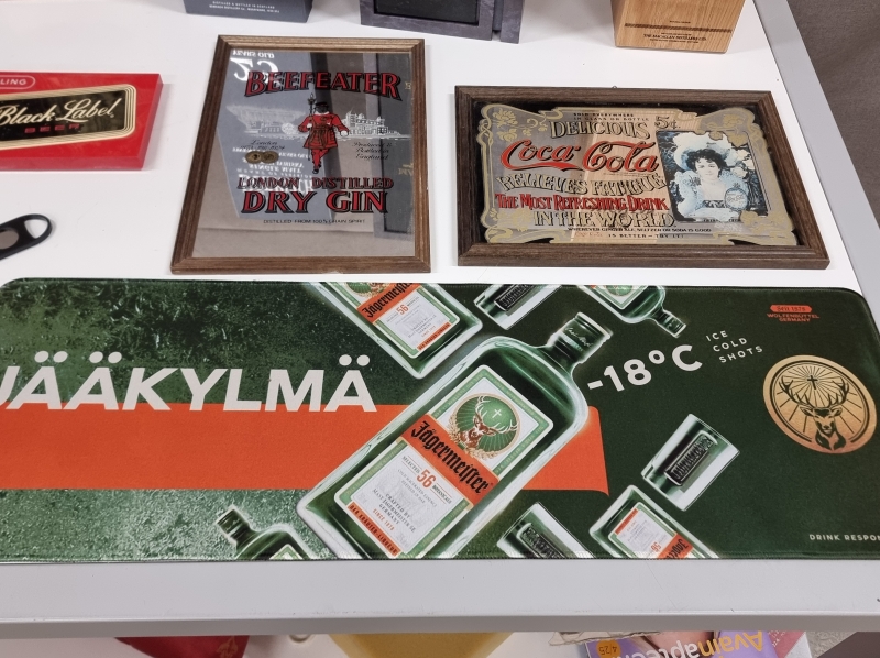 #2425 - Hyvä erä baarirekvisiittaa, mm. tyhjiä viskilaatikoita, peilejä