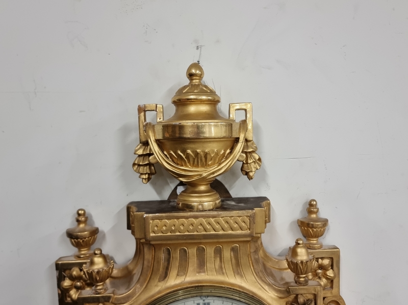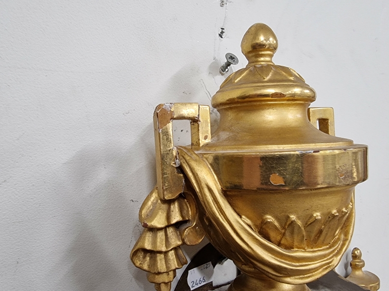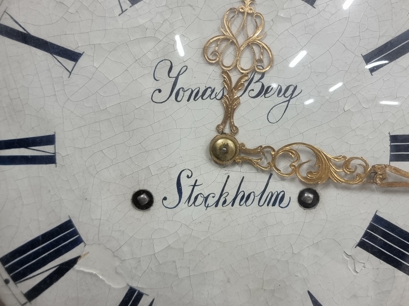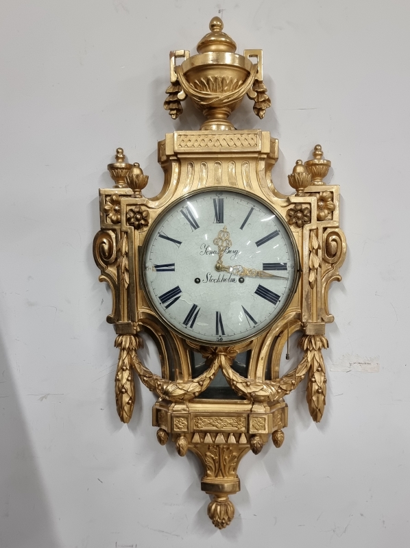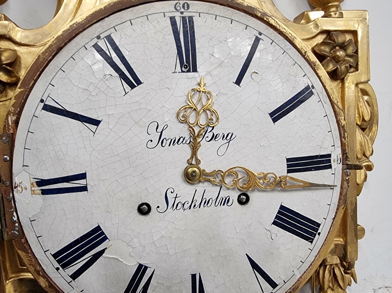 #2051 Vanha 1800-luvun kullattu seinäkello Jonas Berg (uudemmalla koneistolla)