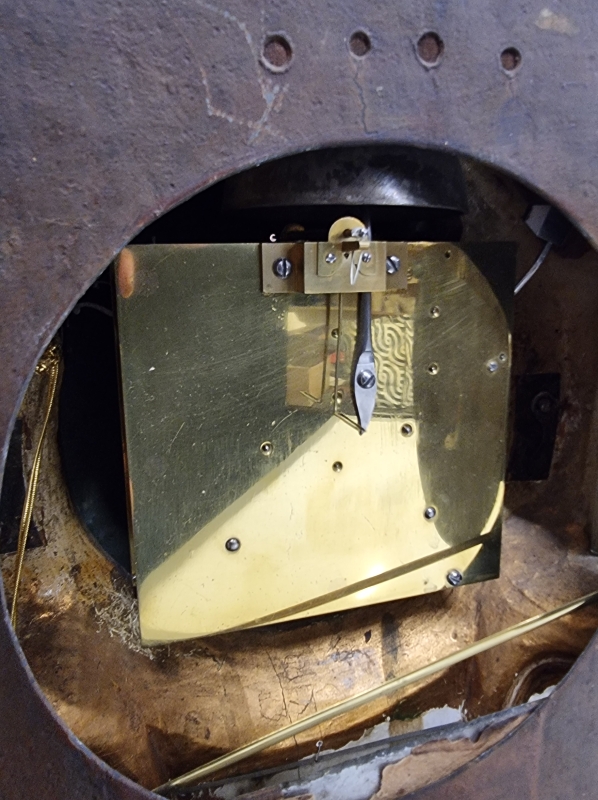Kultauksissa kulumaa, kellotaulussa vikoja, lasi halki ja yläkoristeessa vikaa. Korkeus 93cm ja leveys 45cm.