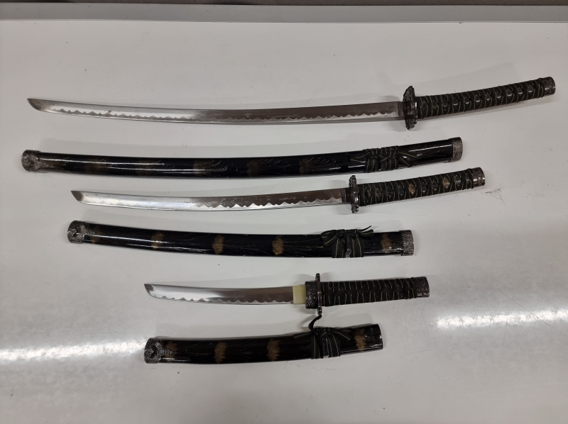 #2237 - 3 kpl koristemiekkoja telineessään.