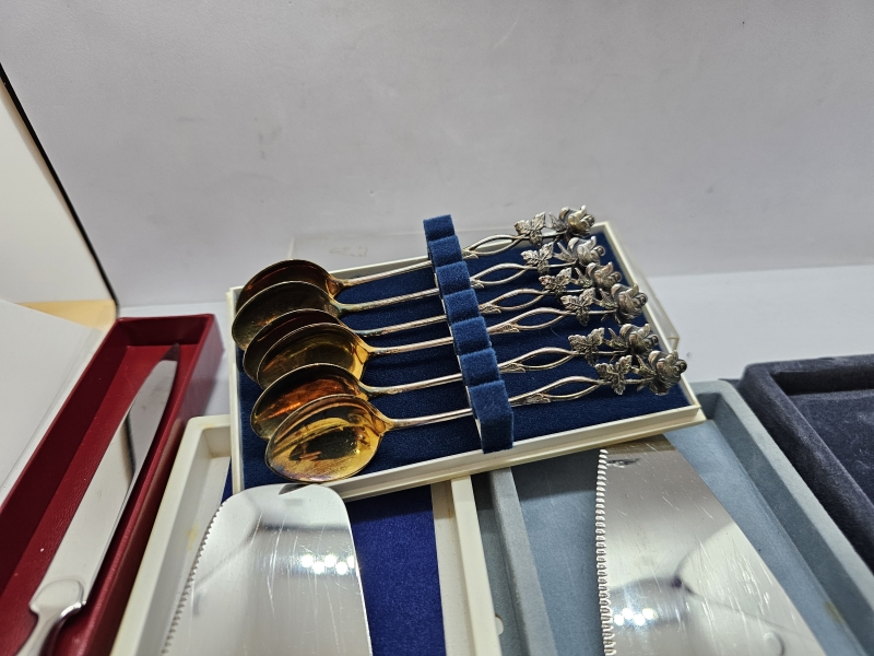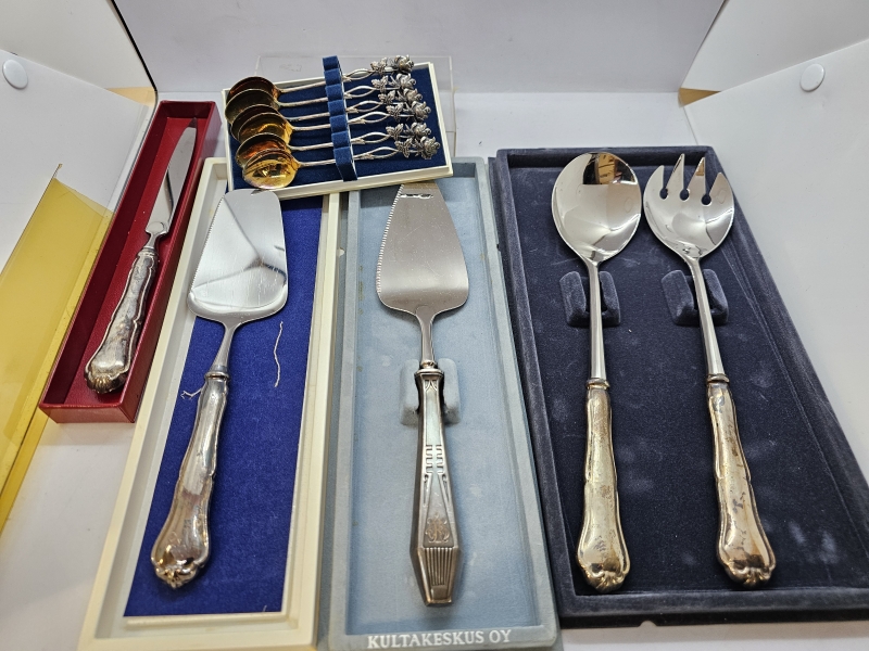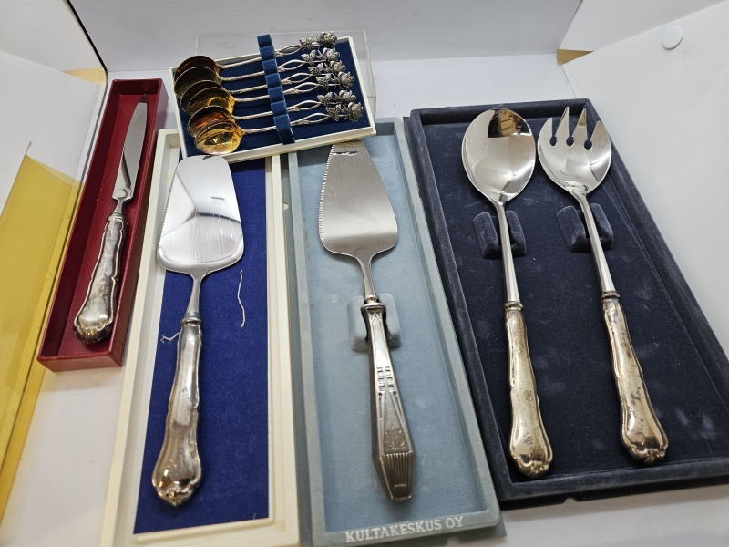 #1288 - Erä hopeaa: 6kpl kahvilusikoita ja ottimia teräskärjillä + Wirkkala teräsmaljakko