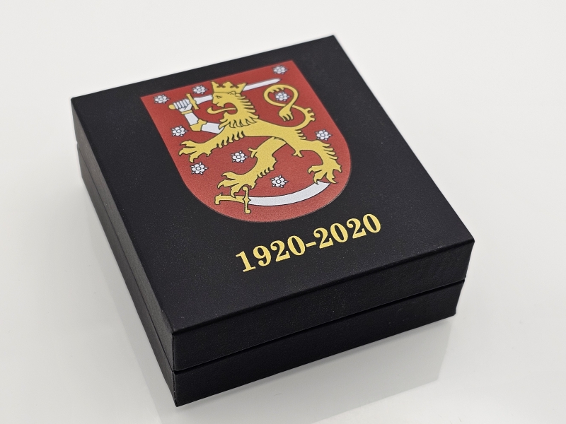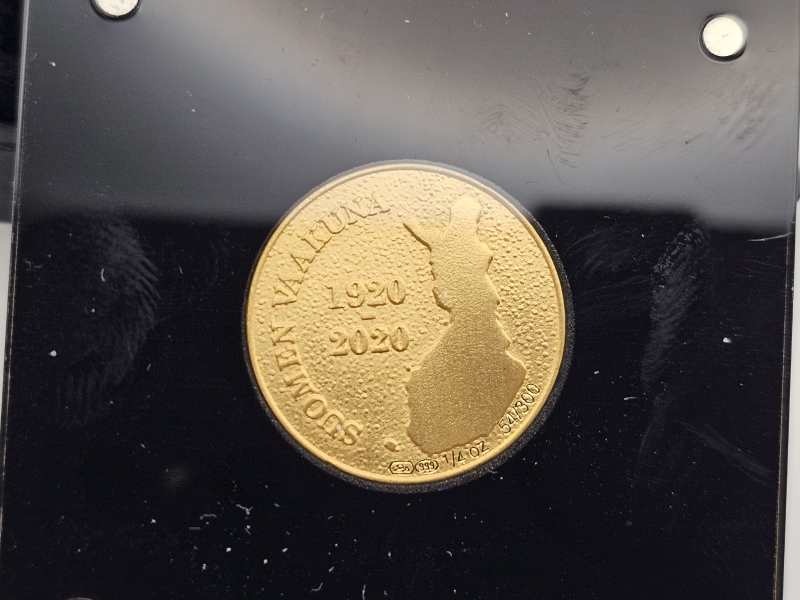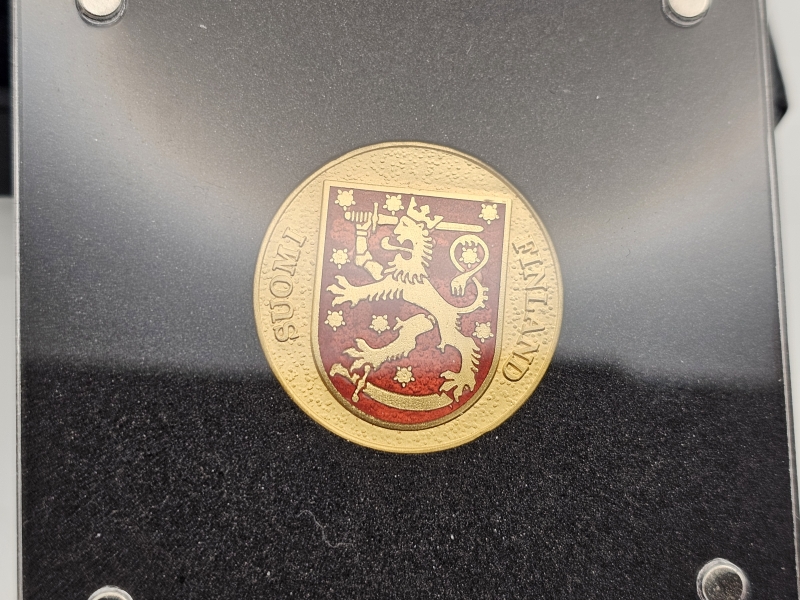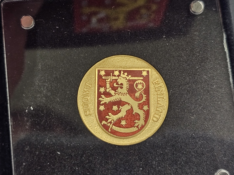 #1306 24k kultainen numeroitu mitali: Suomen vaakuna 100v, emalikoristeella, 7,77g