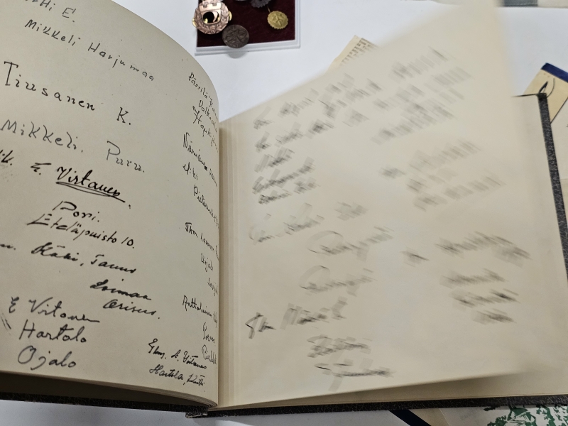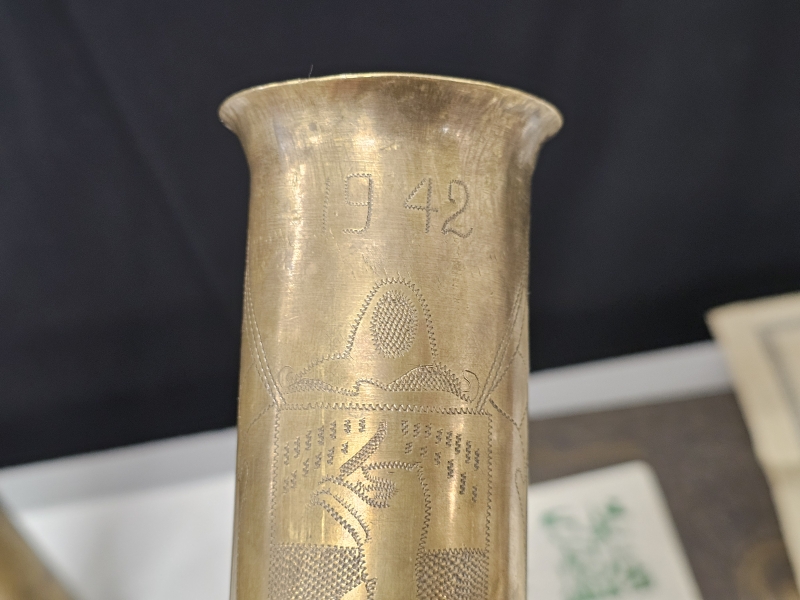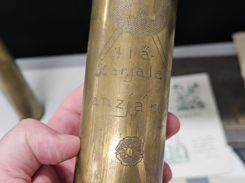 #1670 - Erä sotamuistoja: Mm. puhdetyö hylsy, muistokansio, suojeluskunta tinakuppi ym.