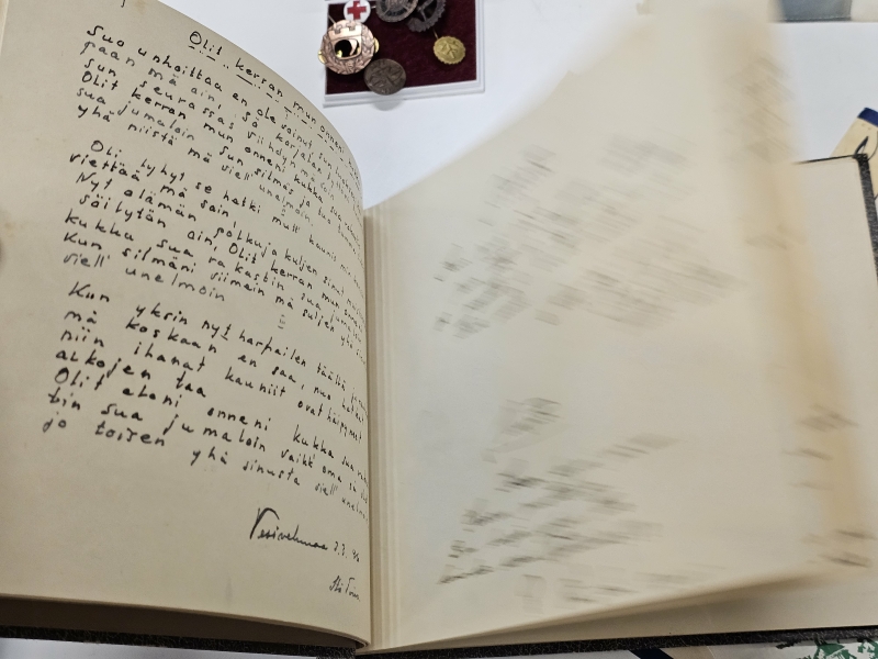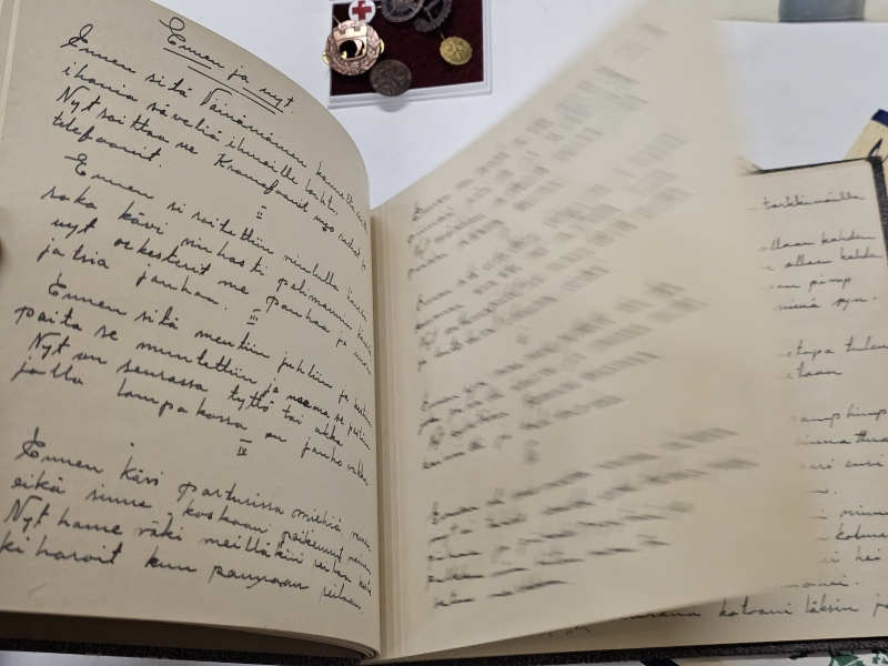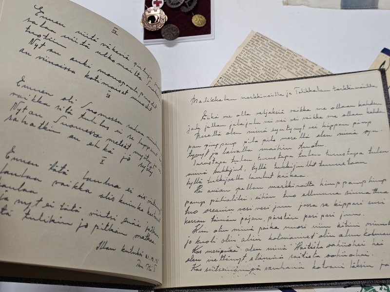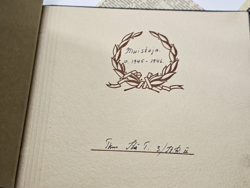 #1670 Erä sotamuistoja: Mm. puhdetyö hylsy, muistokansio, suojeluskunta tinakuppi ym.
