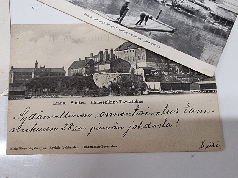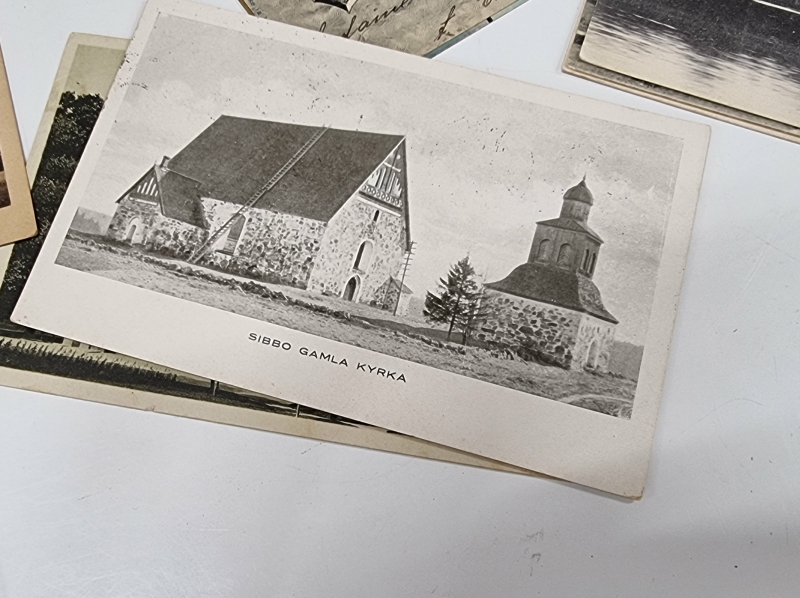 #2516 Vanhoja kortteja, mustekyniä, ym., mm. Suojeluskunta kalvosinnappi